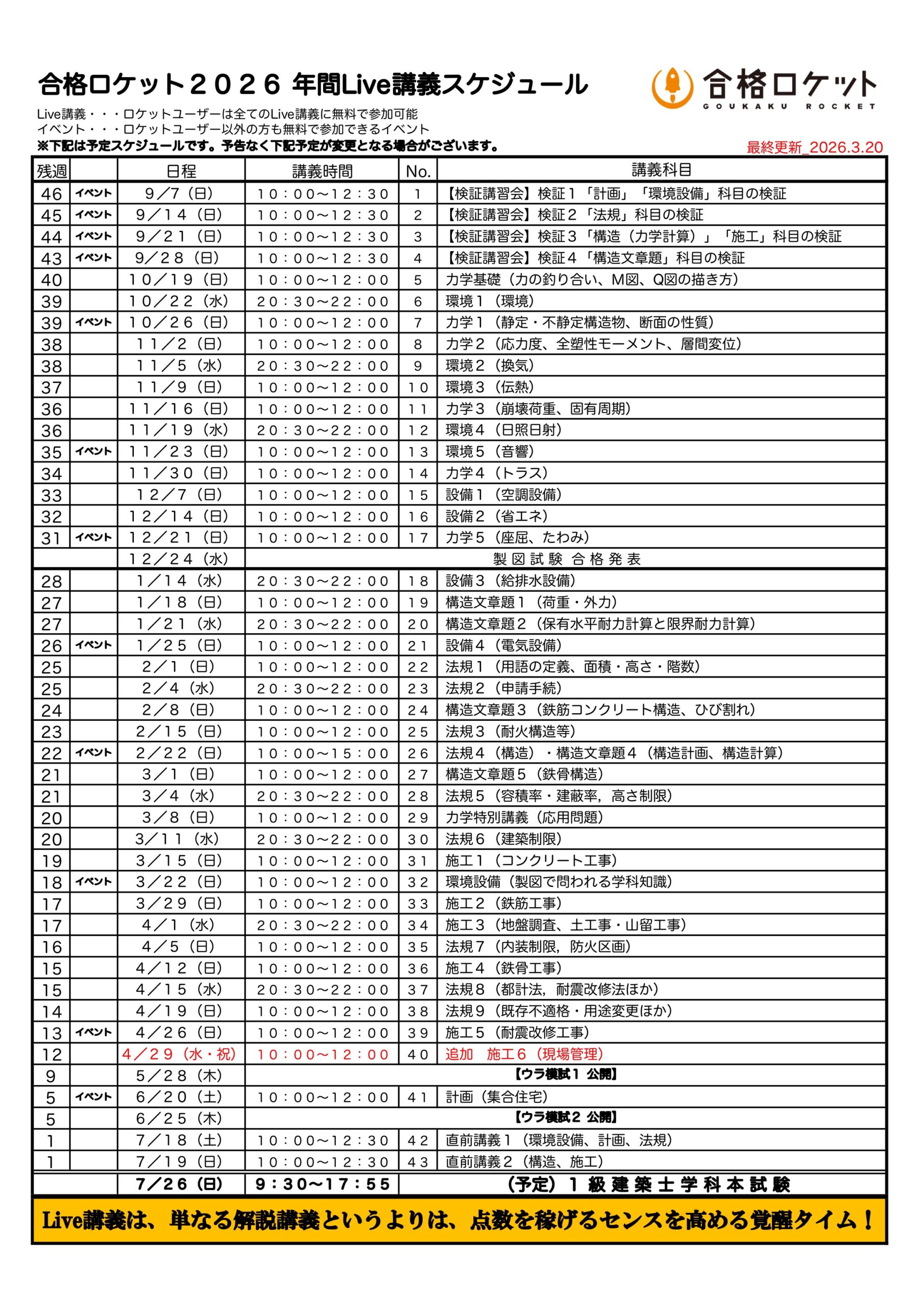 2026 LIVE講義の年間スケジュール(PDF)