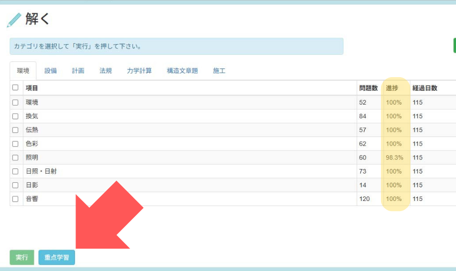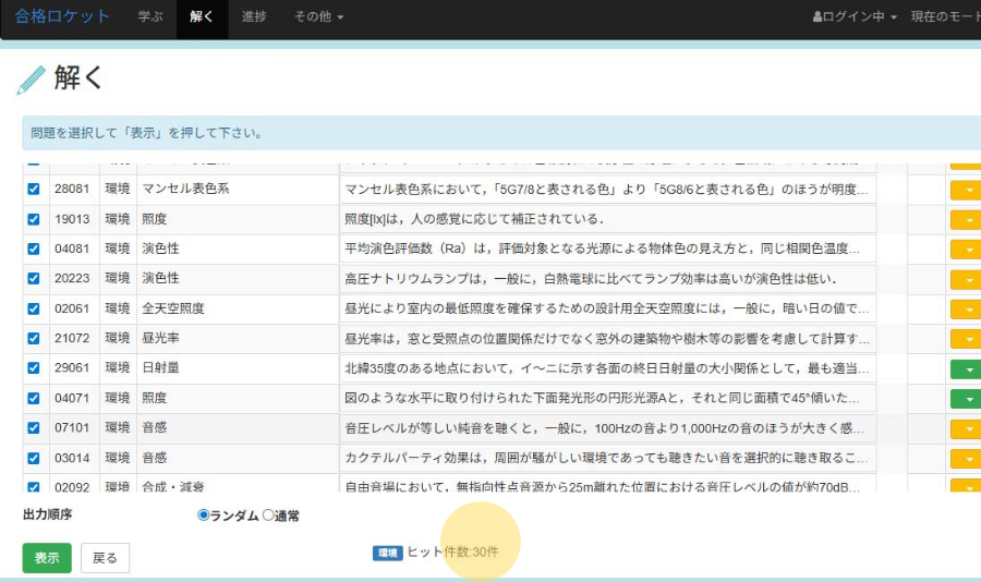 「重点学習(水色)」をクリックすると30問を抽出します。あとは通常の「解く」と同様です。